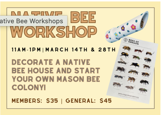 We’ll start out the class with a lesson on the different types of native bees here in the Willamette Valley, and the various kinds of habitat they need. Then we will decorate mason bee houses. Students will also receive several mason bee cocoons to start their own colony, seed packets to plant native flowers in their yard, plenty of information on native bees, and a poster with the different native bees found right here in Oregon.