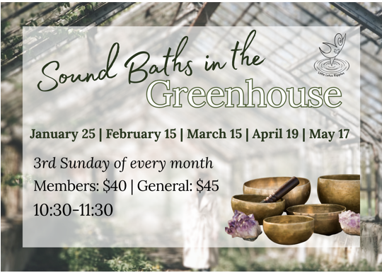 Little Lotus Ripples is coming to the Garden to guide you through an hour long Sound Bath while being immerse in a unique experience within our Tropical Greenhouse! The Tropical Greenhouse is temperature controlled and stays 72 degrees year round making it an ideal area to be protected from weather, surrounded by unique plants, and be entranced by a beautiful Sound Bath.